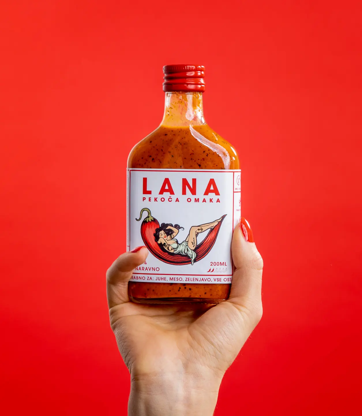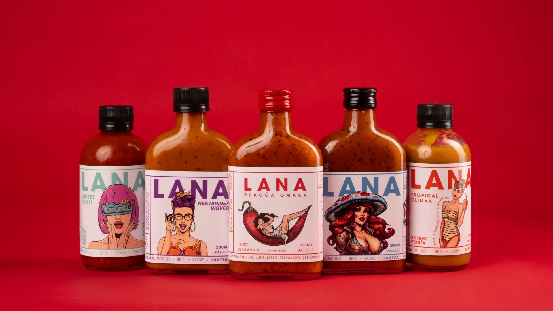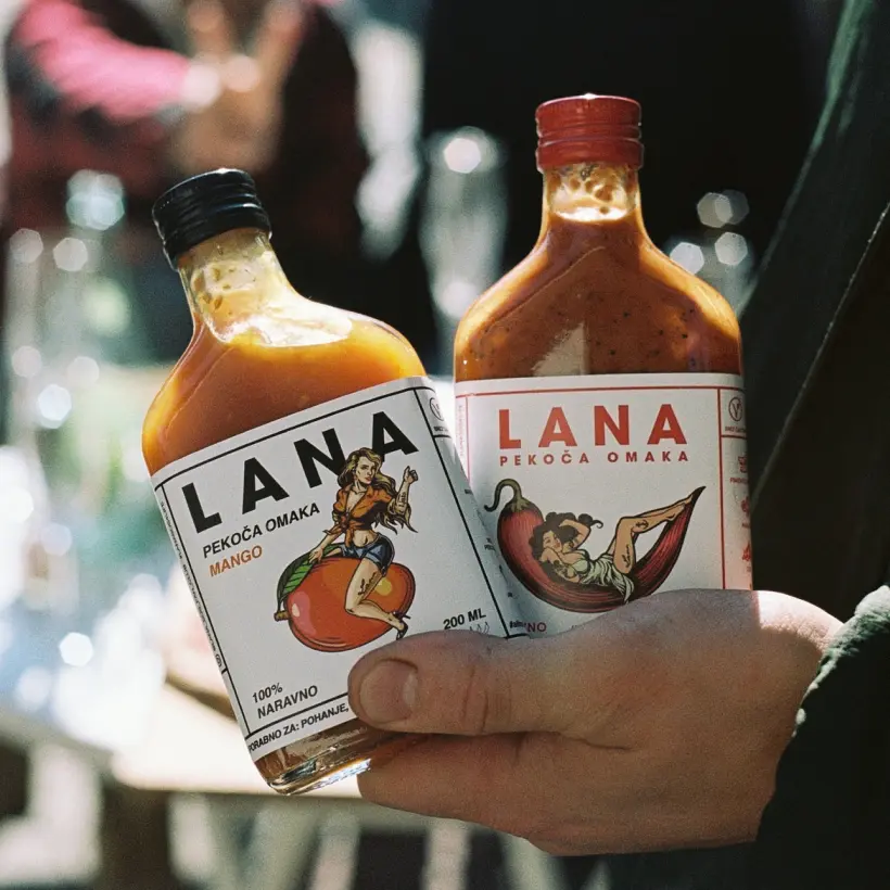 We created a bold and instantly recognisable identity that positioned Lana as the coolest spicy sauce in Slovenia. At the centre of the brand stands Lana herself — a charismatic pin-up muse reimagined for modern food culture. Each flavour introduces a new version of her, giving every sauce its own character, story, and attitude.